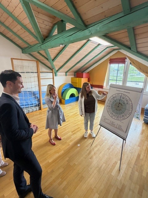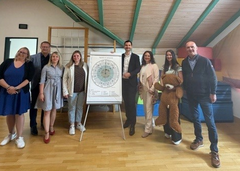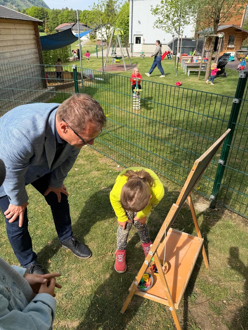 Anschließend wurden die Kinderbildungs- und -betreuungseinrichtungen, die „Kindertagesstätte Gänseblümchen“ und den „Kindergarten Glücksbären“ – beide werden von der Kindernest gem. GmbH betrieben – besucht. Unter Teilnahme von Claudia Orasch, MBA, Geschäftsführerin des Kärnten weit agierenden Trägers wurden Räumlichkeiten und Außenanlagen besichtigt, Bgm. Helmut Ogris berichtete über die bis 2021 getätigten notwendigen baulichen Erweiterungen. Durch die Kindergartenleitung, Silvia Schumi, BEd wurde das in St. Margareten einzigartig gelebte Konzept der „Transition“ (= gelungener Übergang zwischen den Bildungseinrichtungen Kita –Kindergarten – Volksschule) vorgestellt.