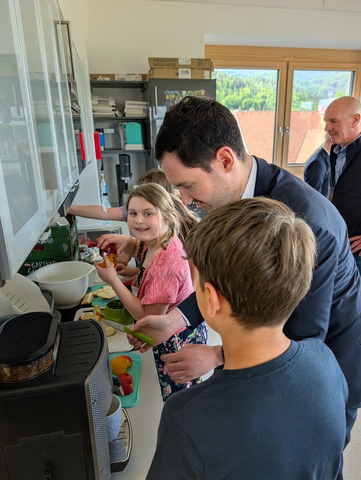 Nach einer kurzen Begrüßung und Vorstellung im Gemeindeamt durch den Bürgermeister Helmut Ogris, den Vizebürgermeister Adolf Wernig und Gemeindevorständin, Sabrina Svetits, wurde die 2021 mustersanierte Volkschule besucht, wo der Schulchor mit ihrem „Siegerlied“ des Landesjugendsingens 2026 den Landesrat und die Nationalratsabgeordnete begrüßte. Bei der darauffolgenden Besichtigung der gesamten Volksschule (Neubau und Sanierter Altbau) beeindruckten die nachhaltigen Sanierungsmaßnahmen, das moderne Raumkonzept, sowie die ausgezeichnete Ausstattung der Volksschule.