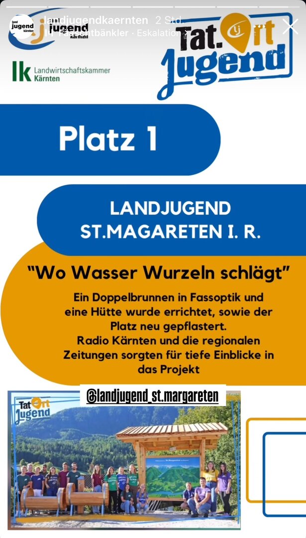 „Die Gemeinde St. Margareten im Rosental freut sich sehr, dass unsere Landjugend beim Tat.Ort Jugend-Wettbewerb den landesweit 1. Preis gewonnen hat – Herzliche Gratulation! Es ist nicht nur ein Sieg, sondern ein wertvoller Beitrag für unsere Gemeinschaft. Danke für euren Einsatz!“