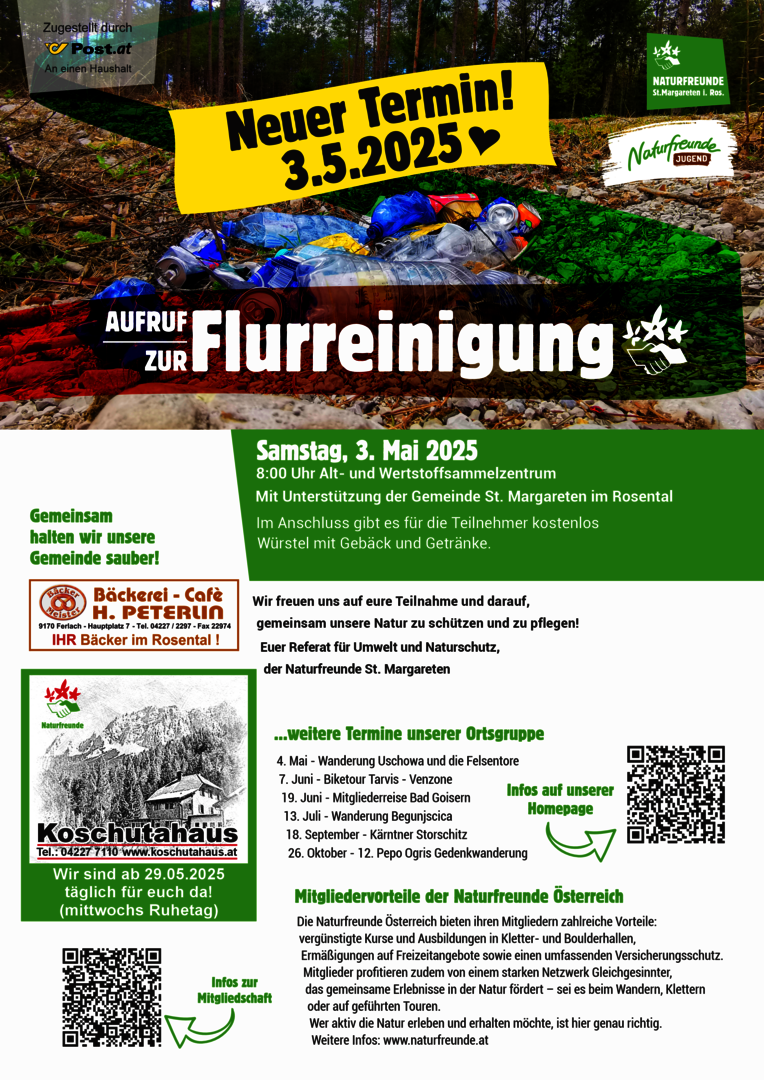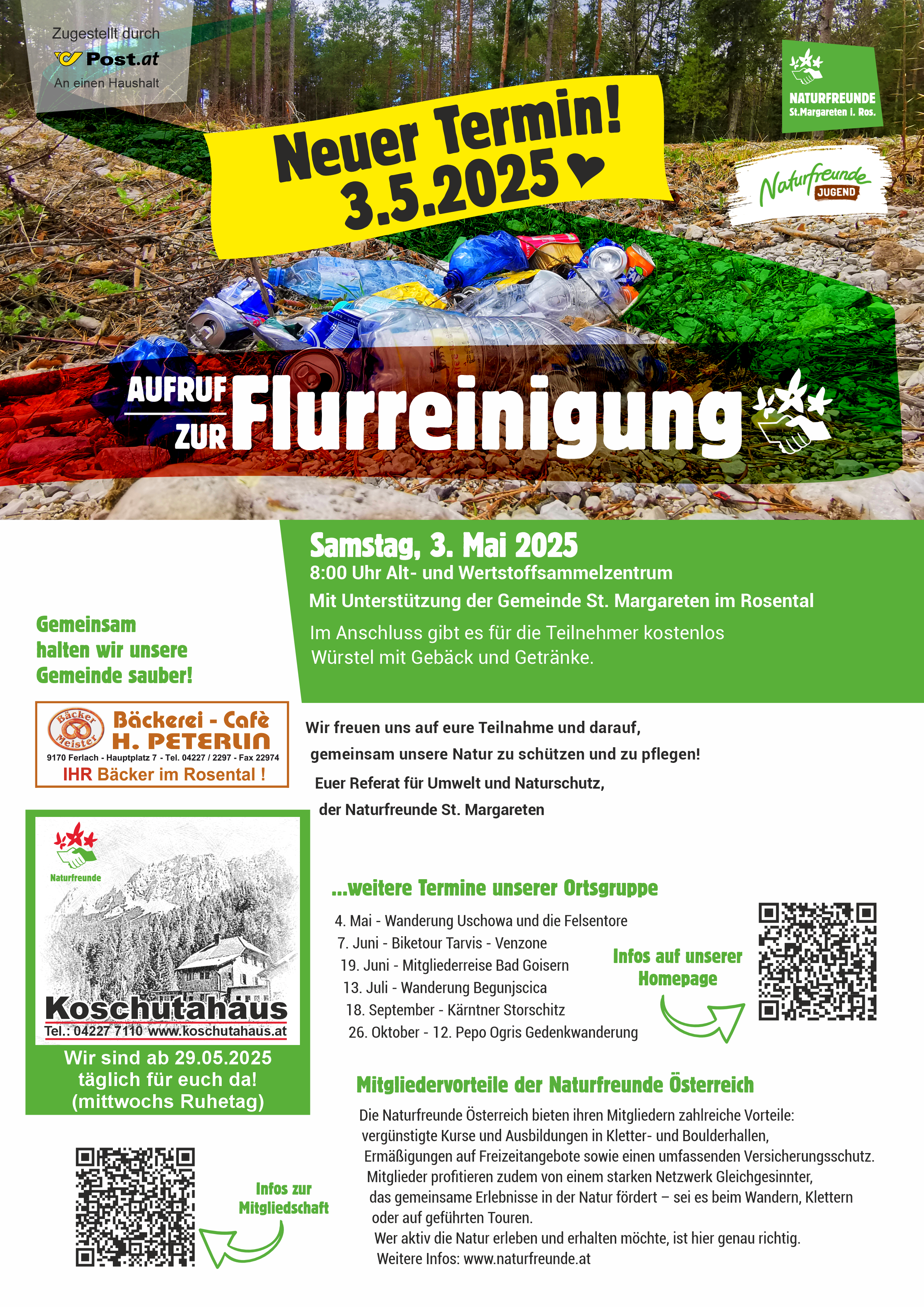 Seit über zwei Jahrzehnten organisieren die Naturfreunde St. Margareten gemeinsam mit der Gemeinde – und zeitweise auch mit Unterstützung der Volksschule – die jährliche Flurreinigung. Dabei werden jedes Jahr säckeweise Abfälle aus unserer Natur entfernt. Über die Jahre hinweg ist so eine beträchtliche Menge Müll zusammengekommen.